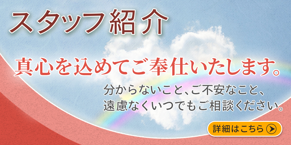 地域地場に根ざしたご葬儀・お別れ式にこだわり、「家族葬プラン」「火葬式プラン」のご葬儀・お別れ式サービスを提供しております。ご不安な喪主様の心を和らげ、安心してご葬儀を行えるますよう、経験豊富な自社スタッフがきめ細かくサポートいたします。