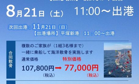 TOPICS『【合同・委託散骨のお知らせ】令和3年8月21日 (土) 11:00〜横浜ぷかり桟橋より出港』を更新いたしました。